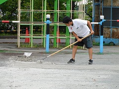 校庭整備では、運動会の練習で躓いてけがをしないよう